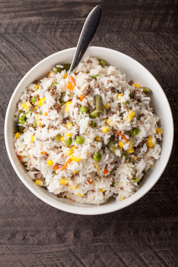 So I thought to myself, I do have some white rice (I prefer brown, but I needed something quick – food storage to the rescue!). But rice alone, isn’t enough. I always like to include vegetables and/or fruit with all of my meals. I had some frozen mixed veggies and I also had some frozen pre-cooked hamburger meat. (The biggest time saving tip for meals I can give is to buy your hamburger meat in bulk and cook it all within a day or two of bringing it home from the store. I then rinse it with hot water to get off excess grease and fat (personal preference) and then bag it up in 1/2 lb. – 1 lb. serving sizes for quick meals. This one thing has saved many a meal.)